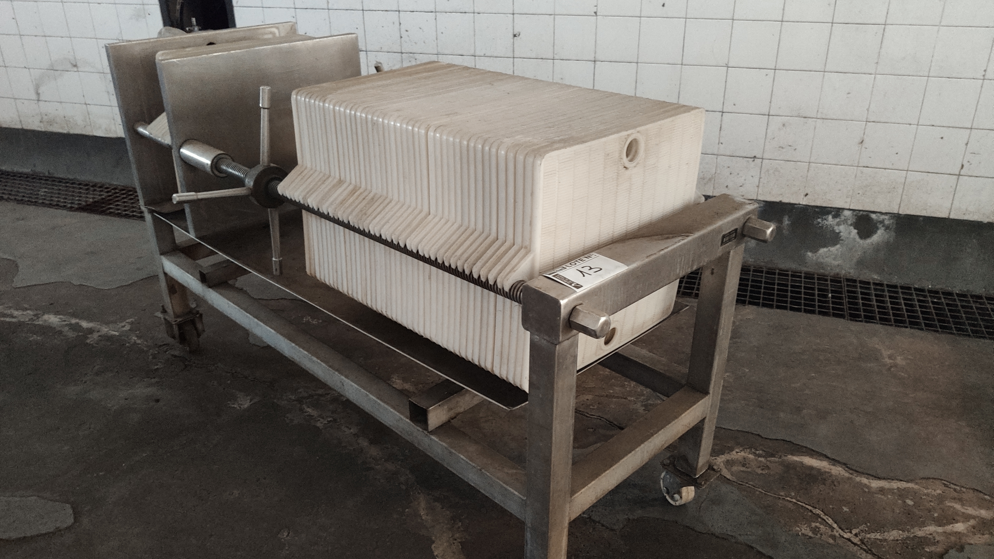 FILTRO PRENSA TIPO MECANICO A TORNILLO. CONSTRUIDO EN ACERO AL CARBONO. CON ACCIONAMIENTO MECANICO A TORNILLO, PLACAS PLASTICAS DE 400 X 400 MM.- CON POSIBLES FALTANTES - ACTIVO 11356 |