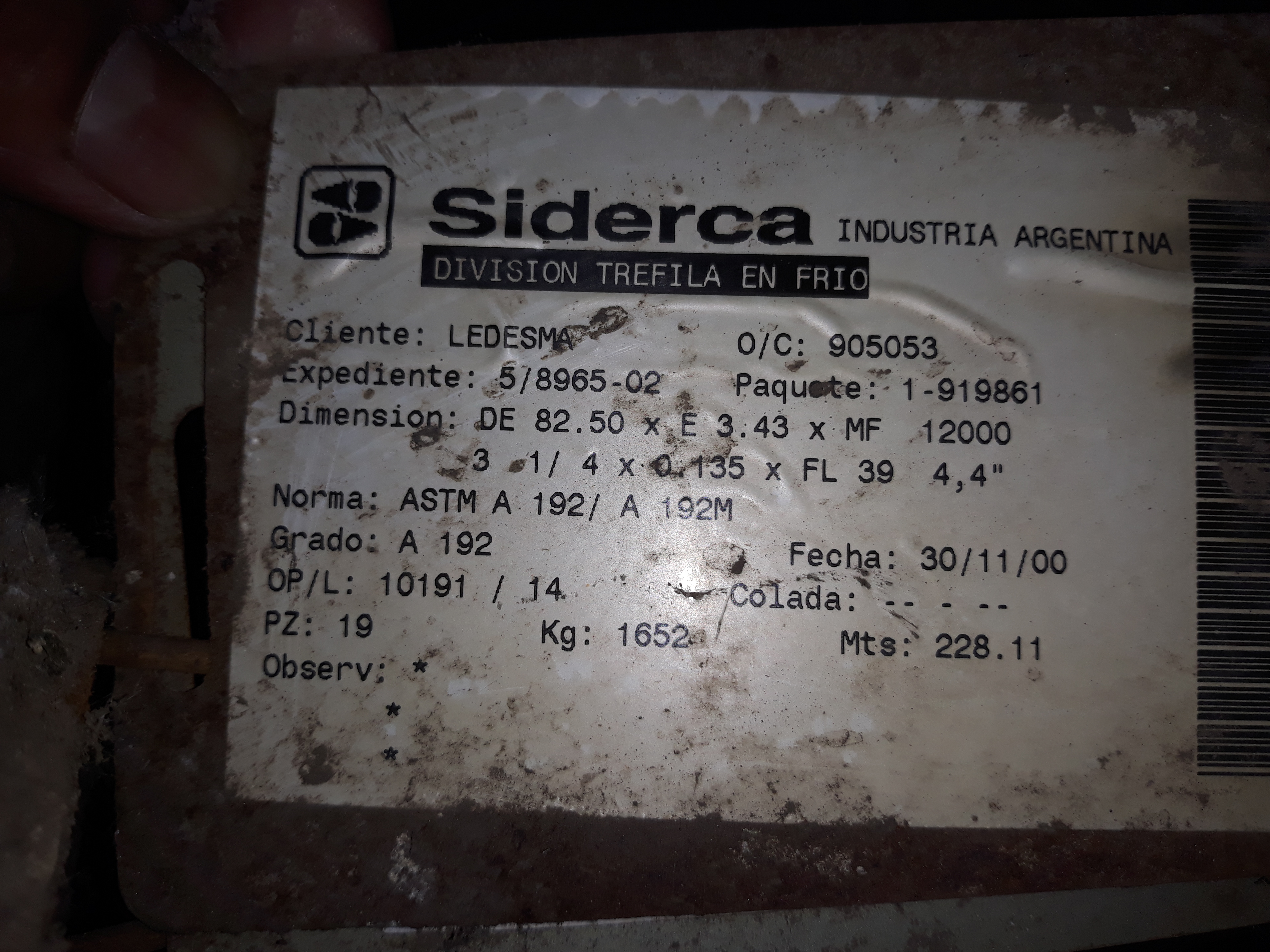 241 METROS DEL CODIGO 1033254 (CAÑO ASTMA192 3.1/4" 3,5MM EXTREMLI) - (TUBO ACERO ASTM A/192 D.EXT.3.1/4 ESP.PARED 3,5MM L.12M MATERIAL RECUBIERTO C/ACEITE ANTICORROSIVO) - EN PAQUETES DE 10 UNIDADES - PESO APROXIMADO POR PAQUETE 1600 kg. - LARGO DE LOS CAÑOS ES DE 12 MTS. - DETALLE Y CANTIDADES APROXIMADOS. |