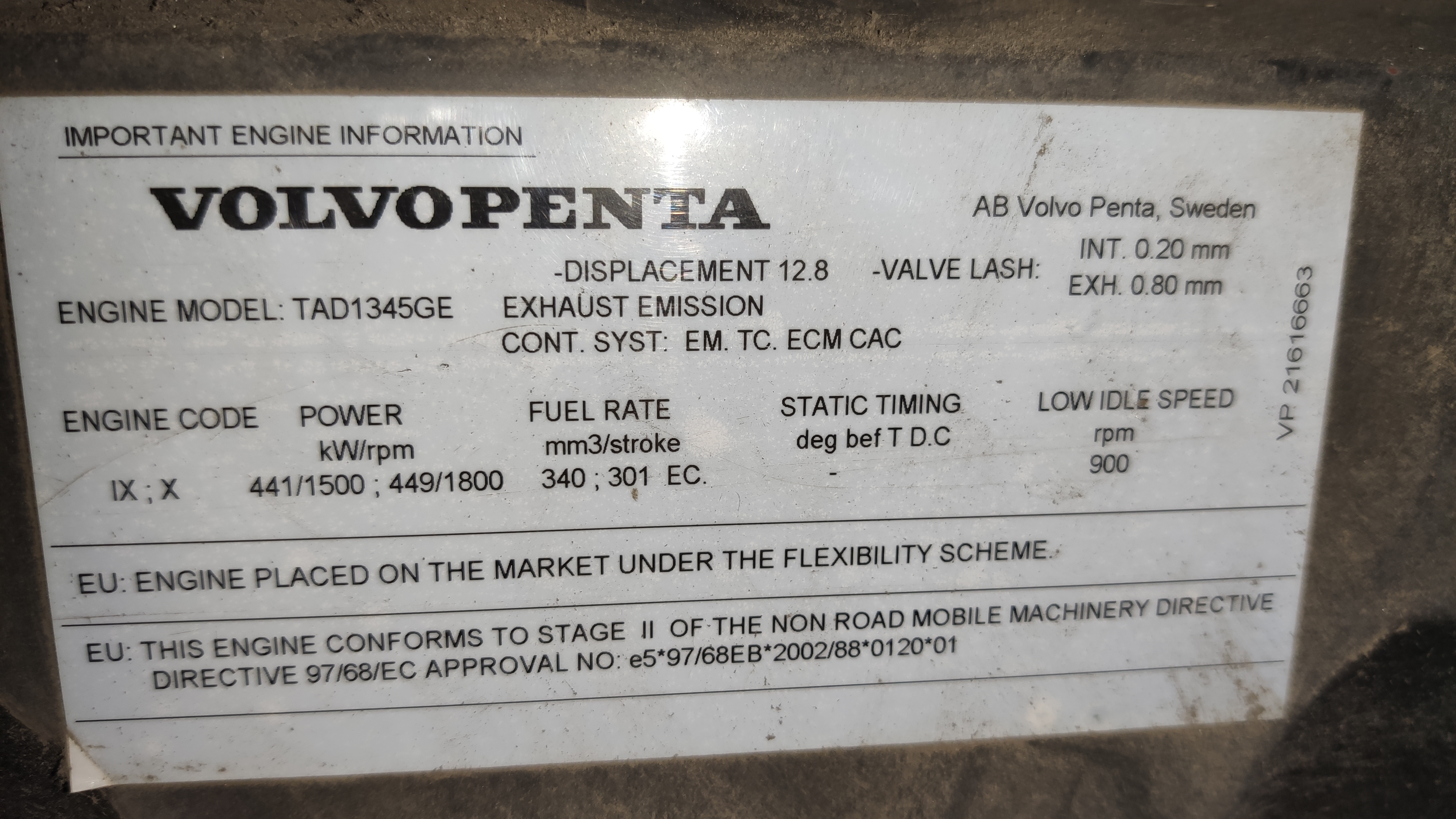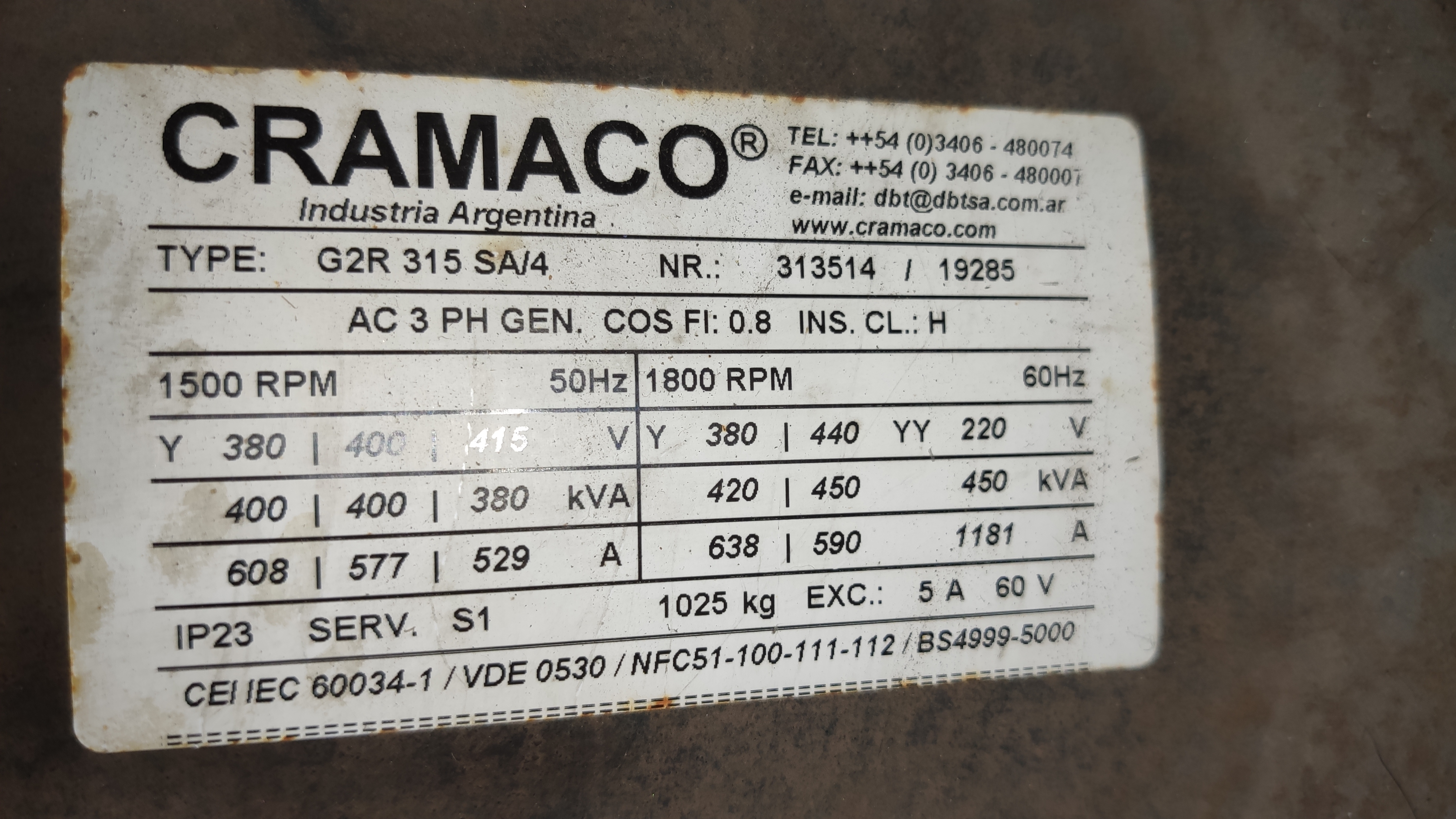 GRUPO ELECTROGENO DE 450KVA CRAMACO CABINADO TYPE: G2R 315 SA/4 nº 313514/19285 - MOTOR VOLVO PENTA MODEL: TAD1345GE KW441/RPM1500, KW449/RPM1800 - SIN TABLERO EXTERNO - TIENE FALTANTES - A DESINSTALAR (CABLE Y ENREJADO) |