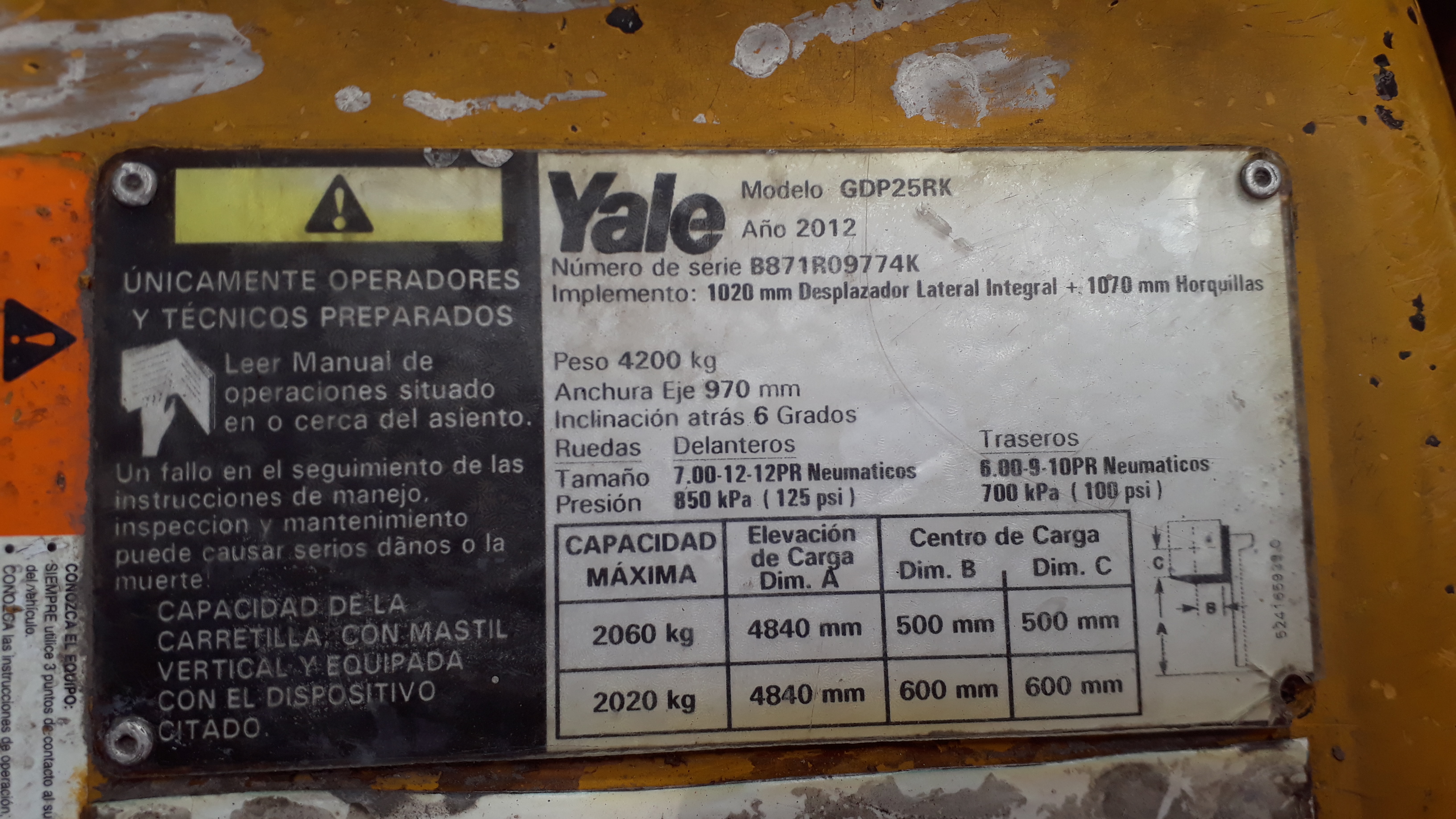 AUTOELEVADOR YALE MODELO GDP25RK - HORAS 11420 - TORRE TRIPLE CON DESPLAZADOR Y UÑAS - SERIE Nº B871R09774K - ACTIVO Nº 20641 - INT. 3 - SIN PATENTAR Y SIN DOCUMENTACION REGISTRAL. |