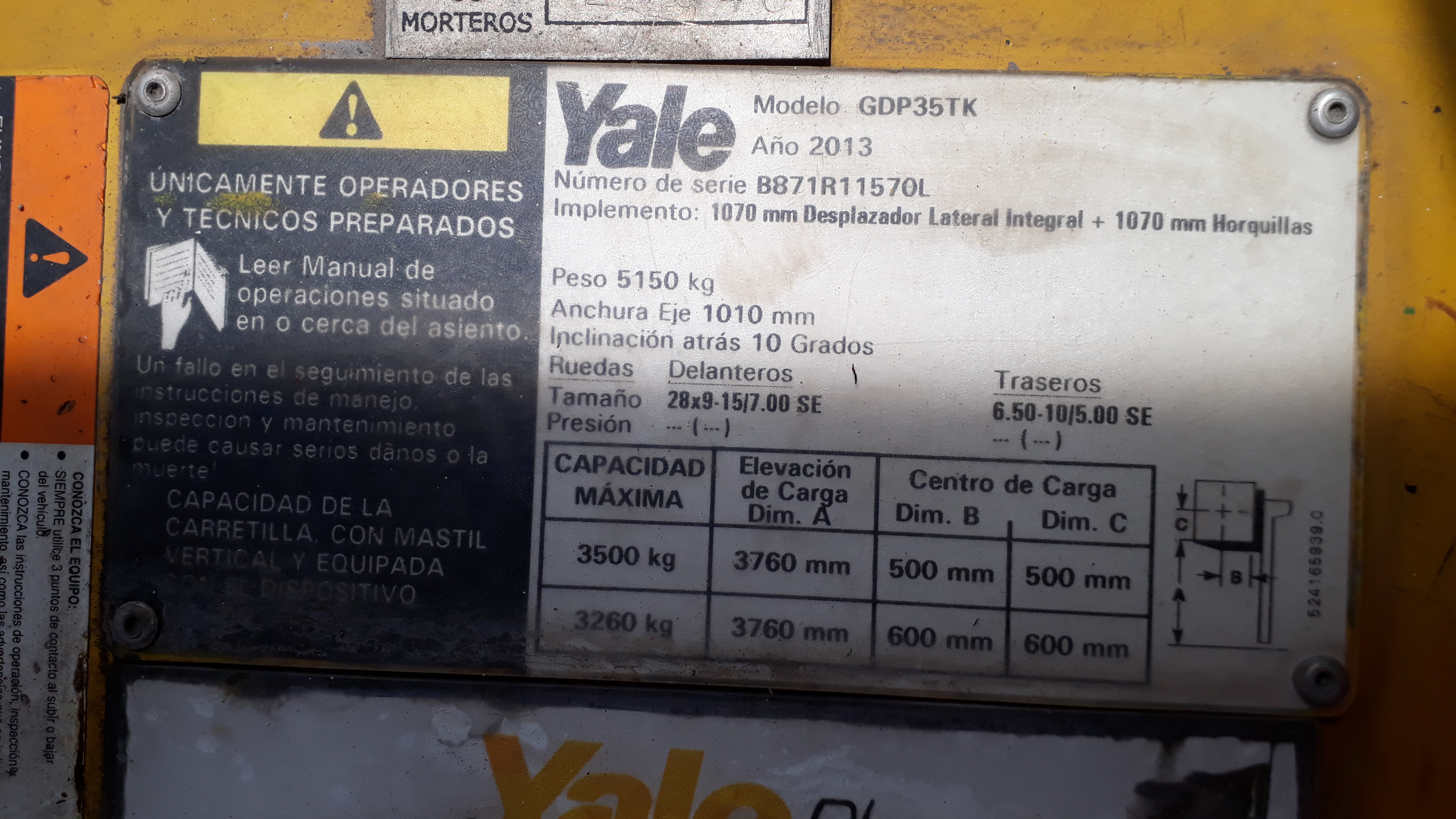 AUTOELEVADOR YALE MODELO GDP35TK - TORRE DOBLE CON DESPLAZADOR Y UÑAS - SERIE Nº B871R11570L - ACTIVO Nº 20846 - INT. 5 - SIN FUNCIONAR - SIN PATENTAR Y SIN DOCUMENTACION REGISTRAL. |