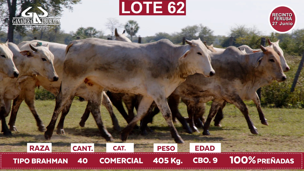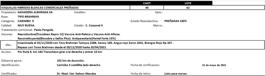 "Inseminada el 25/11/2020 con Toro Brahman Tamyco 2288, Sarory 169, Angus rojo Zorro 1641, Brangus Rojo Rp 207.
