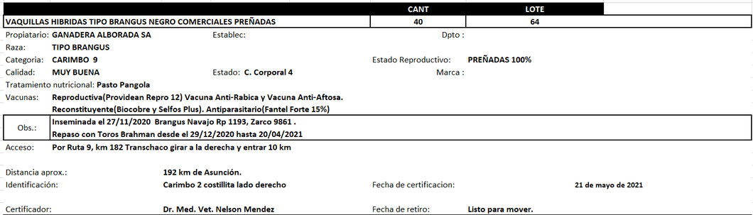 | Sanidad | "Reproductiva(Providean Repro 12) Vacuna Anti-Rabica y Vacuna Anti-Aftosa. Repaso con Toros Brahman desde el 29/12/2020 hasta 20/04/2021." |