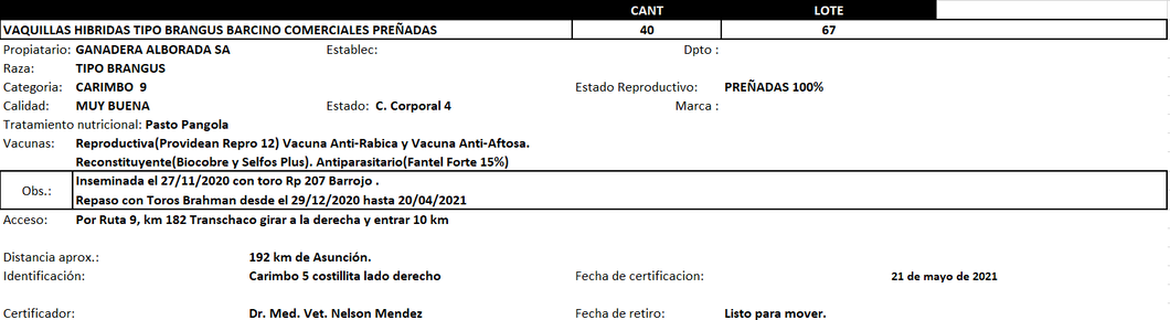 | Sanidad | "Reproductiva(Providean Repro 12) Vacuna Anti-Rabica y Vacuna Anti-Aftosa. Repaso con Toros Brahman desde el 29/12/2020 hasta 20/04/2021." |