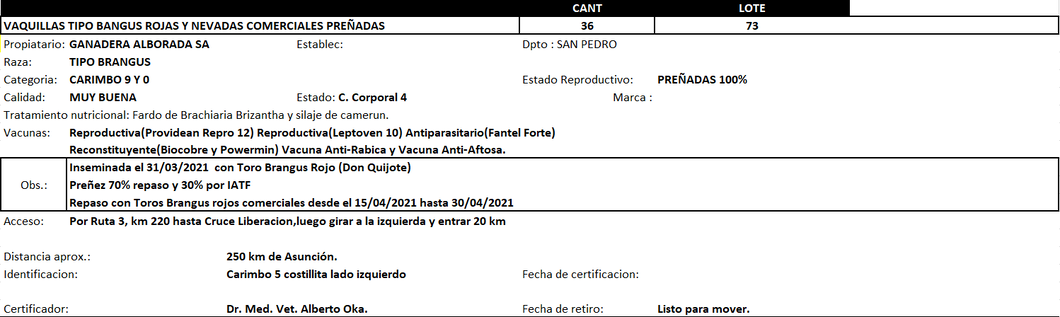"Inseminada el 31/03/2021 con Toro Brangus Rojo (Don Quijote).