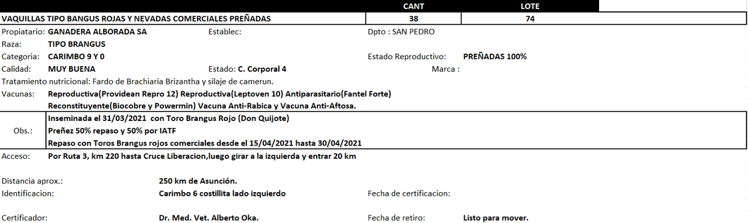 "Inseminada el 31/03/2021 con Toro Brangus Rojo (Don Quijote).
