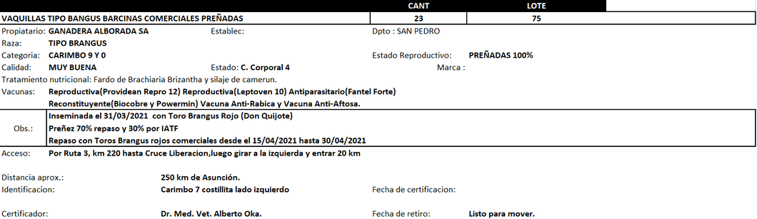 "Inseminada el 31/03/2021 con Toro Brangus Rojo (Don Quijote).