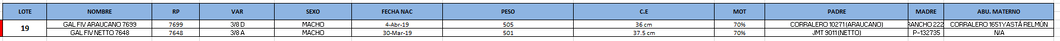 | NOMBRE | "RP 7699 - GAL FIV ARAUCANO 7699 RP 7648 - GAL FIV NETTO 7648" |