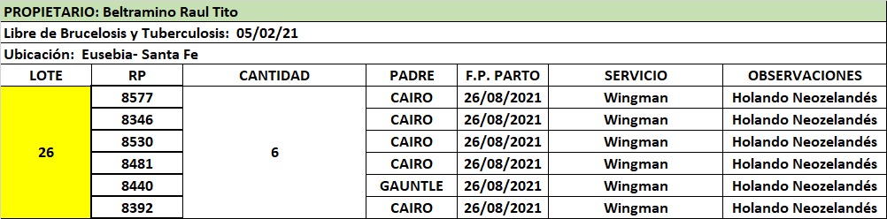 LOTE 26, VAQUILLONAS PREÑADAS 2 BELTRAMINO Lote Anterior Volver al remate Lote Siguiente Ficha Contacto Santa Fe - Eusebia Ficha del Lote Identificador: #122703 Cantidad: 6 Categoría: Vaquillonas preñadas Pedigree Plazo 30, 60, 90 y 120 días Raza Holando Argentino Santa Fe - Eusebia 80 Visualizaciones ClicData Contacto Comercial a cargo: Julio Empresa: Cooperativa Agrícola Ganadera Guillermo Lehmann Nombre*: Teléfono* : E-mail* : Mensaje Enviar Registrese gratis Este contenido Exclusivo está disponible sólo para usuarios registrados Ingresar