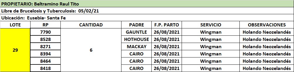 LOTE 29, VAQUILLONAS PREÑADAS 5 BELTRAMINO 🔥 🔥 🔥 Lote Anterior Volver al remate Lote Siguiente Ficha Contacto Santa Fe - Eusebia Ficha del Lote Identificador: #122725 Cantidad: 6 Categoría: Vaquillonas preñadas Pedigree Plazo 30, 60, 90 y 120 días Raza Holando Argentino Santa Fe - Eusebia 91 Visualizaciones ClicData Contacto Comercial a cargo: Julio Empresa: Cooperativa Agrícola Ganadera Guillermo Lehmann Nombre*: Teléfono* : E-mail* : Mensaje Enviar Registrese gratis Este contenido Exclusivo está disponible sólo para usuarios registrados Ingresar