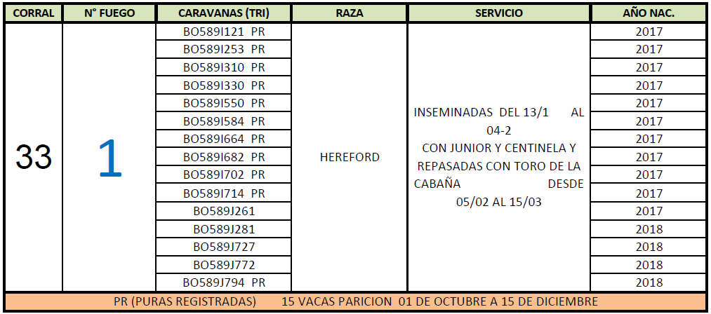 | Observaciones | Inseminadas del 13/1 al 4/2 con Junio y Centinela. Parición Sept.-Oct-Nov. |