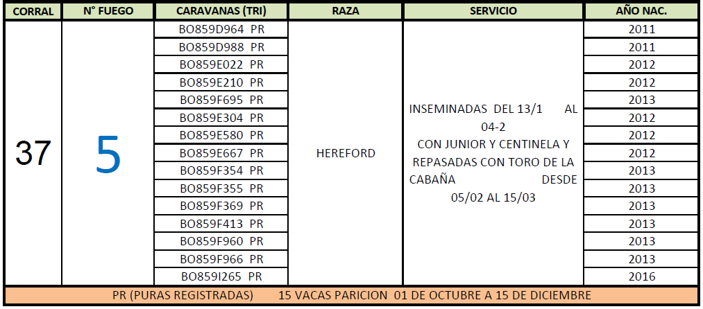 | Observaciones | Inseminadas del 13/1 al 4/2 con Junio y Centinela. Parición Sept.-Oct-Nov. |
