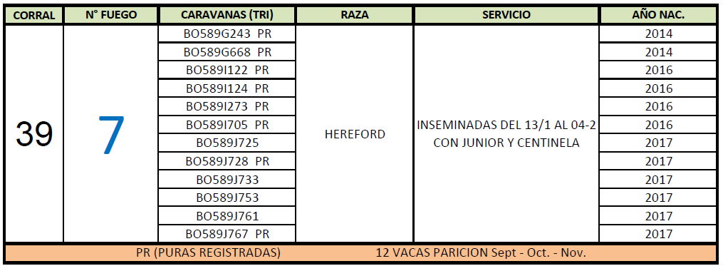 | Observaciones | Inseminadas del 13/1 al 4/2 con Junio y Centinela. Parición Sept.-Oct-Nov. |