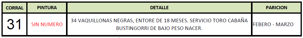 | Observaciones | Servicio toro negro de bajo peso nacer, Parición Febrero - Marzo |