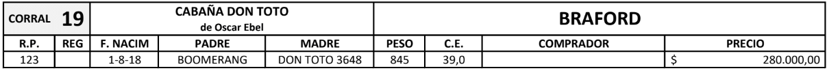 LOTE 4, TOROS(CORRAL 19)BRAFORD "CABAÑA DON TOTO" 🔥 🔥 🔥 Lote Anterior Volver al remate Lote Siguiente Información del Lote Pedigree Ofertar Contacto Chaco - Gral. San Martín Información del Lote Identificador: #126651 Categoría Toros Raza Braford Certificado 1 Departamento Chaco Ubicación Gral. San Martín Plazo Consultar Chaco - Gral. San Martín Ofertar Fecha de cierre: 02 de Septiembre a las 16:05hs. Prórroga: 5 minutos Aún no tiene ofertas Plazo: Contado 30 días 45 días 60 días 90 días 120 días 180 días Contado, 30 y 60 dias Su Oferta en $: − + Step: -5.000,00 / +5.000,00 Programar puja hasta: Programar puja hasta Aumentar puja programada 290000 380000 **Oferta al bulto Iniciar sesión para ofertar Ofertar Compra por $ 99.000.000,00 Ofertas Recibidas $ Fecha/Hora Estado Este lote aún no tiene preofertas. ¿Estás seguro de comprar el LOTE TOROS(CORRAL 19)BRAFORD "CABAÑA DON TOTO" por $ 99000000 ? 80 Visualizaciones ClicData Pedigree Contacto Comercial a cargo: Santiago Usandizaga Empresa: CASA USANDIZAGA S.A. Nombre*: E-mail* : Mensaje Enviar Registrese gratis Este contenido Exclusivo está disponible sólo para usuarios registrados Ingresar
