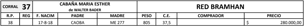LOTE 6, TOROS(CORRAL 37) RED BRAMHAN "CABAÑA MARIA ESTHER" 🔥 🔥 🔥 Lote Anterior Volver al remate Lote Siguiente Información del Lote Pedigree Ofertar Contacto Chaco - Gral. San Martín Información del Lote Identificador: #126663 Categoría Toros Raza Brahman Certificado 1 Departamento Chaco Ubicación Gral. San Martín Plazo Consultar Chaco - Gral. San Martín Ofertar Fecha de cierre: 02 de Septiembre a las 16:05hs. Prórroga: 5 minutos Aún no tiene ofertas Plazo: Contado 30 días 45 días 60 días 90 días 120 días 180 días Contado, 30 y 60 dias Su Oferta en $: − + Step: -5.000,00 / +5.000,00 Programar puja hasta: Programar puja hasta Aumentar puja programada 290000 380000 **Oferta al bulto Iniciar sesión para ofertar Ofertar Compra por $ 99.000.000,00 Ofertas Recibidas $ Fecha/Hora Estado Este lote aún no tiene preofertas. ¿Estás seguro de comprar el LOTE TOROS(CORRAL 37) RED BRAMHAN "CABAÑA MARIA ESTHER" por $ 99000000 ? 58 Visualizaciones ClicData Pedigree Contacto Comercial a cargo: Santiago Usandizaga Empresa: CASA USANDIZAGA S.A. Nombre*: E-mail* : Mensaje Enviar Registrese gratis Este contenido Exclusivo está disponible sólo para usuarios registrados Ingresar