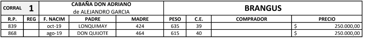 LOTE 9, TOROS(CORRAL 1)BRANGUS "CABAÑA DON ADRIANO" Lote Anterior Volver al remate Lote Siguiente Información del Lote Animales del Lote Pedigree Ofertar Contacto Chaco - Gral. San Martín Información del Lote Identificador: #126668 Cantidad 2 Categoría Toros Raza Brangus Certificado 1 Departamento Chaco Ubicación Gral. San Martín Plazo Consultar Chaco - Gral. San Martín Ofertar Fecha de cierre: 02 de Septiembre a las 16:05hs. Prórroga: 5 minutos Aún no tiene ofertas Animales: 839 868 Plazo: Contado 30 días 45 días 60 días 90 días 120 días 180 días Contado, 30 y 60 dias Su Oferta en $: − + Step: -5.000,00 / +5.000,00 Programar puja hasta: Programar puja hasta Aumentar puja programada 260000 350000 **Oferta al bulto Iniciar sesión para ofertar Ofertar Compra por $ 99.000.000,00 Ofertas Recibidas $ Fecha/Hora Estado Este lote aún no tiene preofertas. ¿Estás seguro de comprar el LOTE TOROS(CORRAL 1)BRANGUS "CABAÑA DON ADRIANO" por $ 99000000 ? 39 Visualizaciones ClicData Animales del Lote RP 839 868 PRECIO BASE 0.00 0.00 RP 839 PRECIO BASE 0.00 RP 868 PRECIO BASE 0.00 Pedigree Contacto Comercial a cargo: Santiago Usandizaga Empresa: CASA USANDIZAGA S.A. Nombre*: E-mail* : Mensaje Enviar Registrese gratis Este contenido Exclusivo está disponible sólo para usuarios registrados Ingresar