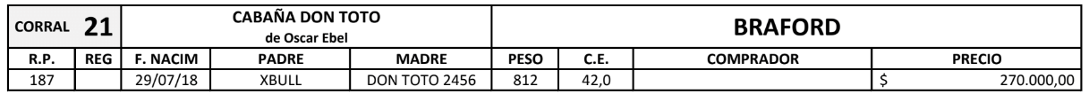 LOTE 18, TOROS(CORRAL 21)BRAFORD "CABAÑA DON TOTO" Lote Anterior Volver al remate Lote Siguiente Información del Lote Pedigree Ofertar Contacto Chaco - Gral. San Martín Información del Lote Identificador: #126684 Categoría Toros Raza Braford Certificado 1 Departamento Chaco Ubicación Gral. San Martín Plazo Consultar Chaco - Gral. San Martín Ofertar Fecha de cierre: 02 de Septiembre a las 16:05hs. Prórroga: 5 minutos Aún no tiene ofertas Plazo: Contado 30 días 45 días 60 días 90 días 120 días 180 días Contado, 30 y 60 dias Su Oferta en $: − + Step: -5.000,00 / +5.000,00 Programar puja hasta: Programar puja hasta Aumentar puja programada 280000 370000 **Oferta al bulto Iniciar sesión para ofertar Ofertar Compra por $ 99.000.000,00 Ofertas Recibidas $ Fecha/Hora Estado Este lote aún no tiene preofertas. ¿Estás seguro de comprar el LOTE TOROS(CORRAL 21)BRAFORD "CABAÑA DON TOTO" por $ 99000000 ? 45 Visualizaciones ClicData Pedigree Contacto Comercial a cargo: Santiago Usandizaga Empresa: CASA USANDIZAGA S.A. Nombre*: E-mail* : Mensaje Enviar Registrese gratis Este contenido Exclusivo está disponible sólo para usuarios registrados Ingresar