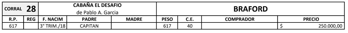 LOTE 24, TOROS(CORRAL 28)BRAFORD "CABAÑA EL DESAFIO" Lote Anterior Volver al remate Lote Siguiente Información del Lote Pedigree Ofertar Contacto Chaco - Gral. San Martín Información del Lote Identificador: #126696 Categoría Toros Raza Braford Certificado 1 Departamento Chaco Ubicación Gral. San Martín Plazo Consultar Chaco - Gral. San Martín Ofertar Fecha de cierre: 02 de Septiembre a las 16:05hs. Prórroga: 5 minutos Aún no tiene ofertas Plazo: Contado 30 días 45 días 60 días 90 días 120 días 180 días Contado, 30 y 60 dias Su Oferta en $: − + Step: -5.000,00 / +5.000,00 Programar puja hasta: Programar puja hasta Aumentar puja programada 260000 350000 **Oferta al bulto Iniciar sesión para ofertar Ofertar Compra por $ 99.000.000,00 Ofertas Recibidas $ Fecha/Hora Estado Este lote aún no tiene preofertas. ¿Estás seguro de comprar el LOTE TOROS(CORRAL 28)BRAFORD "CABAÑA EL DESAFIO" por $ 99000000 ? 22 Visualizaciones ClicData Pedigree Contacto Comercial a cargo: Santiago Usandizaga Empresa: CASA USANDIZAGA S.A. Nombre*: E-mail* : Mensaje Enviar Registrese gratis Este contenido Exclusivo está disponible sólo para usuarios registrados Ingresar