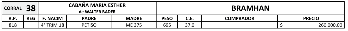 LOTE 25, TOROS(CORRAL 38)BRAMHAN "CABAÑA MARIA ESTHER" Lote Anterior Volver al remate Lote Siguiente Información del Lote Pedigree Ofertar Contacto Chaco - Gral. San Martín Información del Lote Identificador: #126697 Categoría Toros Raza Brahman Certificado 1 Departamento Chaco Ubicación Gral. San Martín Plazo Consultar Chaco - Gral. San Martín Ofertar Fecha de cierre: 02 de Septiembre a las 16:05hs. Prórroga: 5 minutos Aún no tiene ofertas Plazo: Contado 30 días 45 días 60 días 90 días 120 días 180 días Contado, 30 y 60 dias Su Oferta en $: − + Step: -5.000,00 / +5.000,00 Programar puja hasta: Programar puja hasta Aumentar puja programada 270000 360000 **Oferta al bulto Iniciar sesión para ofertar Ofertar Compra por $ 99.000.000,00 Ofertas Recibidas $ Fecha/Hora Estado Este lote aún no tiene preofertas. ¿Estás seguro de comprar el LOTE TOROS(CORRAL 38)BRAMHAN "CABAÑA MARIA ESTHER" por $ 99000000 ? 43 Visualizaciones ClicData Pedigree Contacto Comercial a cargo: Santiago Usandizaga Empresa: CASA USANDIZAGA S.A. Nombre*: E-mail* : Mensaje Enviar Registrese gratis Este contenido Exclusivo está disponible sólo para usuarios registrados Ingresar