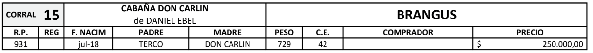 LOTE 26, TOROS(CORRAL 15)BRANGUS "CABAÑA DON CARLIN" Lote Anterior Volver al remate Lote Siguiente Información del Lote Pedigree Ofertar Contacto Chaco - Gral. San Martín Información del Lote Identificador: #126698 Categoría Toros Raza Brangus negro Certificado 1 Departamento Chaco Ubicación Gral. San Martín Plazo Consultar Chaco - Gral. San Martín Ofertar Fecha de cierre: 02 de Septiembre a las 16:05hs. Prórroga: 5 minutos Aún no tiene ofertas Plazo: Contado 30 días 45 días 60 días 90 días 120 días 180 días Contado, 30 y 60 dias Su Oferta en $: − + Step: -5.000,00 / +5.000,00 Programar puja hasta: Programar puja hasta Aumentar puja programada 260000 350000 **Oferta al bulto Iniciar sesión para ofertar Ofertar Compra por $ 99.000.000,00 Ofertas Recibidas $ Fecha/Hora Estado Este lote aún no tiene preofertas. ¿Estás seguro de comprar el LOTE TOROS(CORRAL 15)BRANGUS "CABAÑA DON CARLIN" por $ 99000000 ? 20 Visualizaciones ClicData Pedigree Contacto Comercial a cargo: Santiago Usandizaga Empresa: CASA USANDIZAGA S.A. Nombre*: E-mail* : Mensaje Enviar Registrese gratis Este contenido Exclusivo está disponible sólo para usuarios registrados Ingresar