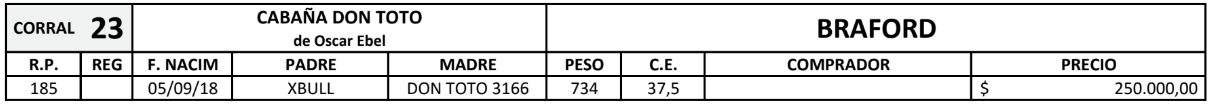 LOTE 29, TOROS(CORRAL 23)BRAFORD "CABAÑA DON TOTO" Lote Anterior Volver al remate Lote Siguiente Información del Lote Pedigree Ofertar Contacto Chaco - Gral. San Martín Información del Lote Identificador: #126701 Categoría Toros Raza Braford Certificado 1 Departamento Chaco Ubicación Gral. San Martín Plazo Consultar Chaco - Gral. San Martín Ofertar Fecha de cierre: 02 de Septiembre a las 16:05hs. Prórroga: 5 minutos Aún no tiene ofertas Plazo: Contado 30 días 45 días 60 días 90 días 120 días 180 días Contado, 30 y 60 dias Su Oferta en $: − + Step: -5.000,00 / +5.000,00 Programar puja hasta: Programar puja hasta Aumentar puja programada 260000 350000 **Oferta al bulto Iniciar sesión para ofertar Ofertar Compra por $ 99.000.000,00 Ofertas Recibidas $ Fecha/Hora Estado Este lote aún no tiene preofertas. ¿Estás seguro de comprar el LOTE TOROS(CORRAL 23)BRAFORD "CABAÑA DON TOTO" por $ 99000000 ? 20 Visualizaciones ClicData Pedigree Contacto Comercial a cargo: Santiago Usandizaga Empresa: CASA USANDIZAGA S.A. Nombre*: E-mail* : Mensaje Enviar Registrese gratis Este contenido Exclusivo está disponible sólo para usuarios registrados Ingresar