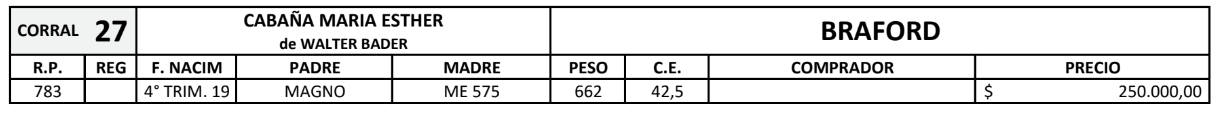 LOTE 30, TOROS(CORRAL 27)BRAFORD "CABAÑA MARIA ESTHER" Lote Anterior Volver al remate Lote Siguiente Información del Lote Pedigree Ofertar Contacto Chaco - Gral. San Martín Información del Lote Identificador: #126703 Categoría Toros Raza Braford Certificado 1 Departamento Chaco Ubicación Gral. San Martín Plazo Consultar Chaco - Gral. San Martín Ofertar Fecha de cierre: 02 de Septiembre a las 16:05hs. Prórroga: 5 minutos Aún no tiene ofertas Plazo: Contado 30 días 45 días 60 días 90 días 120 días 180 días Contado, 30 y 60 dias Su Oferta en $: − + Step: -5.000,00 / +5.000,00 Programar puja hasta: Programar puja hasta Aumentar puja programada 260000 350000 **Oferta al bulto Iniciar sesión para ofertar Ofertar Compra por $ 99.000.000,00 Ofertas Recibidas $ Fecha/Hora Estado Este lote aún no tiene preofertas. ¿Estás seguro de comprar el LOTE TOROS(CORRAL 27)BRAFORD "CABAÑA MARIA ESTHER" por $ 99000000 ? 26 Visualizaciones ClicData Pedigree Contacto Comercial a cargo: Santiago Usandizaga Empresa: CASA USANDIZAGA S.A. Nombre*: E-mail* : Mensaje Enviar Registrese gratis Este contenido Exclusivo está disponible sólo para usuarios registrados Ingresar