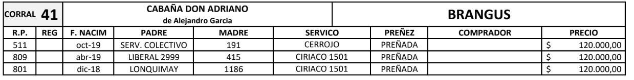 LOTE 49, VAQUILLONAS PREÑADAS(CORRAL 41) BRANGUS "CABAÑA DON ADRIANO" 🔥 🔥 🔥 Lote Anterior Volver al remate Lote Siguiente Información del Lote Animales del Lote Pedigree Ofertar Contacto Chaco - Gral. San Martín Información del Lote Identificador: #126731 Cantidad 3 Categoría Vaquillonas preñadas Raza Brangus Certificado 1 Departamento Chaco Ubicación Gral. San Martín Plazo Consultar Chaco - Gral. San Martín Ofertar Fecha de cierre: 02 de Septiembre a las 16:05hs. Prórroga: 5 minutos Aún no tiene ofertas Animales: 511 809 801 Plazo: Contado 30 días 45 días 60 días 90 días 120 días 180 días Contado, 30 y 60 dias Su Oferta en $: − + Step: -5.000,00 / +5.000,00 Programar puja hasta: Programar puja hasta Aumentar puja programada 130000 220000 **Oferta al bulto Iniciar sesión para ofertar Ofertar Compra por $ 99.000.000,00 Ofertas Recibidas $ Fecha/Hora Estado Este lote aún no tiene preofertas. ¿Estás seguro de comprar el LOTE VAQUILLONAS PREÑADAS(CORRAL 41) BRANGUS "CABAÑA DON ADRIANO" por $ 99000000 ? 94 Visualizaciones ClicData Animales del Lote RP 511 809 801 PRECIO BASE 0.00 0.00 0.00 RP 511 PRECIO BASE 0.00 RP 809 PRECIO BASE 0.00 RP 801 PRECIO BASE 0.00 Pedigree Contacto Comercial a cargo: Santiago Usandizaga Empresa: CASA USANDIZAGA S.A. Nombre*: E-mail* : Mensaje Enviar Registrese gratis Este contenido Exclusivo está disponible sólo para usuarios registrados Ingresar
