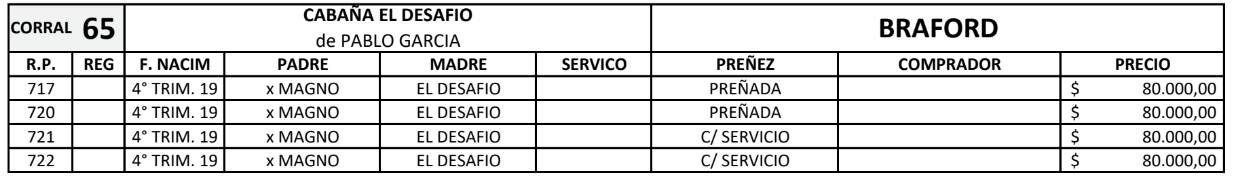 LOTE 60, VAQUILLONAS PREÑADAS(CORRAL 65)BRAFORD "CABAÑA EL DESAFIO" Lote Anterior Volver al remate Lote Siguiente Información del Lote Pedigree Ofertar Contacto Chaco - Gral. San Martín Información del Lote Identificador: #126742 Cantidad 4 Categoría Vaquillonas preñadas Raza Braford Certificado 1 Departamento Chaco Ubicación Gral. San Martín Plazo Consultar Chaco - Gral. San Martín Ofertar Fecha de cierre: 02 de Septiembre a las 16:05hs. Prórroga: 5 minutos Aún no tiene ofertas Plazo: Contado 30 días 45 días 60 días 90 días 120 días 180 días Contado, 30 y 60 dias Su Oferta en $: − + Step: -5.000,00 / +5.000,00 Programar puja hasta: Programar puja hasta Aumentar puja programada 90000 180000 **Oferta al bulto Iniciar sesión para ofertar Ofertar Compra por $ 99.000.000,00 Ofertas Recibidas $ Fecha/Hora Estado Este lote aún no tiene preofertas. ¿Estás seguro de comprar el LOTE VAQUILLONAS PREÑADAS(CORRAL 65)BRAFORD "CABAÑA EL DESAFIO" por $ 99000000 ? 46 Visualizaciones ClicData Pedigree Contacto Comercial a cargo: Santiago Usandizaga Empresa: CASA USANDIZAGA S.A. Nombre*: E-mail* : Mensaje Enviar Registrese gratis Este contenido Exclusivo está disponible sólo para usuarios registrados Ingresar