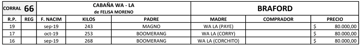 LOTE 71, VAQUILLONAS PARA SERVICIO(CORRAL 66)BRAFORD "CABAÑA WA - LA" Lote Anterior Volver al remate Lote Siguiente Información del Lote Animales del Lote Pedigree Ofertar Contacto Chaco - Gral. San Martín Información del Lote Identificador: #126763 Cantidad 3 Categoría Vaquillonas P/ entorar Raza Braford Certificado 1 Departamento Chaco Ubicación Gral. San Martín Plazo Consultar Chaco - Gral. San Martín Ofertar Fecha de cierre: 02 de Septiembre a las 16:05hs. Prórroga: 5 minutos Aún no tiene ofertas Animales: 19 17 16 16 Plazo: Contado 30 días 45 días 60 días 90 días 120 días 180 días Contado, 30 y 60 dias Su Oferta en $: − + Step: -5.000,00 / +5.000,00 Programar puja hasta: Programar puja hasta Aumentar puja programada 90000 180000 **Oferta al bulto Iniciar sesión para ofertar Ofertar Compra por $ 99.000.000,00 Ofertas Recibidas $ Fecha/Hora Estado Este lote aún no tiene preofertas. ¿Estás seguro de comprar el LOTE VAQUILLONAS PARA SERVICIO(CORRAL 66)BRAFORD "CABAÑA WA - LA" por $ 99000000 ? 29 Visualizaciones ClicData Animales del Lote RP 19 17 16 16 PRECIO BASE 0.00 0.00 0.00 0.00 RP 19 PRECIO BASE 0.00 RP 17 PRECIO BASE 0.00 RP 16 PRECIO BASE 0.00 RP 16 PRECIO BASE 0.00 Pedigree Contacto Comercial a cargo: Santiago Usandizaga Empresa: CASA USANDIZAGA S.A. Nombre*: E-mail* : Mensaje Enviar Registrese gratis Este contenido Exclusivo está disponible sólo para usuarios registrados Ingresar