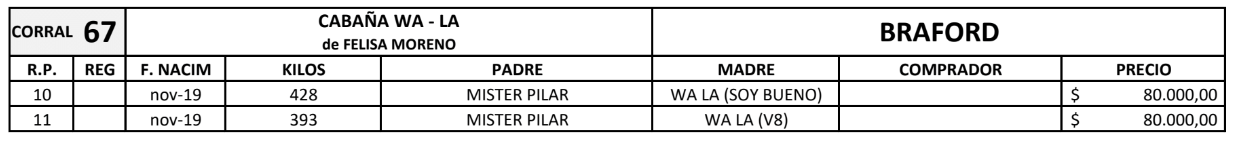LOTE 72, VAQUILLONAS PARA SERVICIO(CORRAL 67)BRAFORD "CABAÑA WA - LA" Lote Anterior Volver al remate Información del Lote Animales del Lote Pedigree Ofertar Contacto Chaco - Gral. San Martín Información del Lote Identificador: #126764 Cantidad 2 Categoría Vaquillonas P/ entorar Raza Braford Certificado 1 Departamento Chaco Ubicación Gral. San Martín Plazo Consultar Chaco - Gral. San Martín Ofertar Fecha de cierre: 02 de Septiembre a las 16:05hs. Prórroga: 5 minutos Aún no tiene ofertas Animales: 10 11 Plazo: Contado 30 días 45 días 60 días 90 días 120 días 180 días Contado, 30 y 60 dias Su Oferta en $: − + Step: -5.000,00 / +5.000,00 Programar puja hasta: Programar puja hasta Aumentar puja programada 90000 180000 **Oferta al bulto Iniciar sesión para ofertar Ofertar Compra por $ 99.000.000,00 Ofertas Recibidas $ Fecha/Hora Estado Este lote aún no tiene preofertas. ¿Estás seguro de comprar el LOTE VAQUILLONAS PARA SERVICIO(CORRAL 67)BRAFORD "CABAÑA WA - LA" por $ 99000000 ? 36 Visualizaciones ClicData Animales del Lote RP 10 11 PRECIO BASE 0.00 0.00 RP 10 PRECIO BASE 0.00 RP 11 PRECIO BASE 0.00 Pedigree Contacto Comercial a cargo: Santiago Usandizaga Empresa: CASA USANDIZAGA S.A. Nombre*: E-mail* : Mensaje Enviar Registrese gratis Este contenido Exclusivo está disponible sólo para usuarios registrados Ingresar