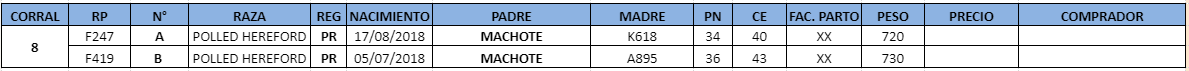 LOTE 8, TOROS GENERALES, CONTROLADOS Y REGISTRADOS 🔥 🔥 🔥 Lote Anterior Volver al remate Lote Siguiente Información del Lote Animales del Lote Pedigree Ofertar Contacto Entre Ríos - Santa Anita Información del Lote Identificador: #126859 Cantidad 2 Categoría Toros PR Raza Polled Hereford Departamento Entre Ríos Ubicación Santa Anita Plazo Consultar Entre Ríos - Santa Anita Ofertar Fecha de cierre: 07 de Septiembre a las 18:15hs. Prórroga: 5 minutos Aún no tiene ofertas Animales: F247 F419 Plazo: Contado 30 días 45 días 60 días 90 días 120 días 180 días Contado, 30 y 60 dias Su Oferta en $: − + Step: -10.000,00 / +10.000,00 Programar puja hasta: Programar puja hasta Aumentar puja programada 280000 460000 **Oferta al bulto Iniciar sesión para ofertar Ofertar Compra por $ 99.000.000,00 Ofertas Recibidas $ Fecha/Hora Estado Este lote aún no tiene preofertas. ¿Estás seguro de comprar el LOTE TOROS GENERALES, CONTROLADOS Y REGISTRADOS por $ 99000000 ? 152 Visualizaciones ClicData Animales del Lote RP F247 F419 PRECIO BASE 0.00 0.00 RP F247 PRECIO BASE 0.00 RP F419 PRECIO BASE 0.00 Pedigree Contacto Comercial a cargo: Facundo Pereyra Empresa: MONASTERIO TATTERSALL S.A. Nombre*: E-mail* : Mensaje Enviar Registrese gratis Este contenido Exclusivo está disponible sólo para usuarios registrados Ingresar