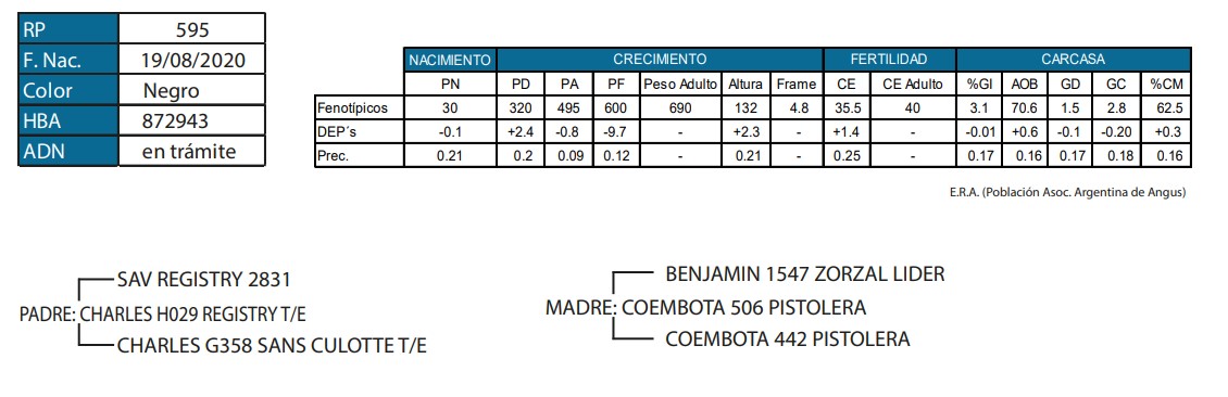 | Observaciones | Área de ojo de bife y un depósito de Grasa dorsal dentro de los parámetros medios de los Reproductores de Pedigree que se correlaciona con índices carniceros aptos para rodeos comerciales pastoriles. Toro muy correcto. |