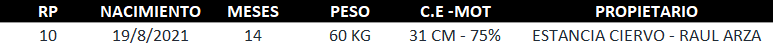 | Establecimiento | ESTANCIA CIERVO - RAUL ARZA |