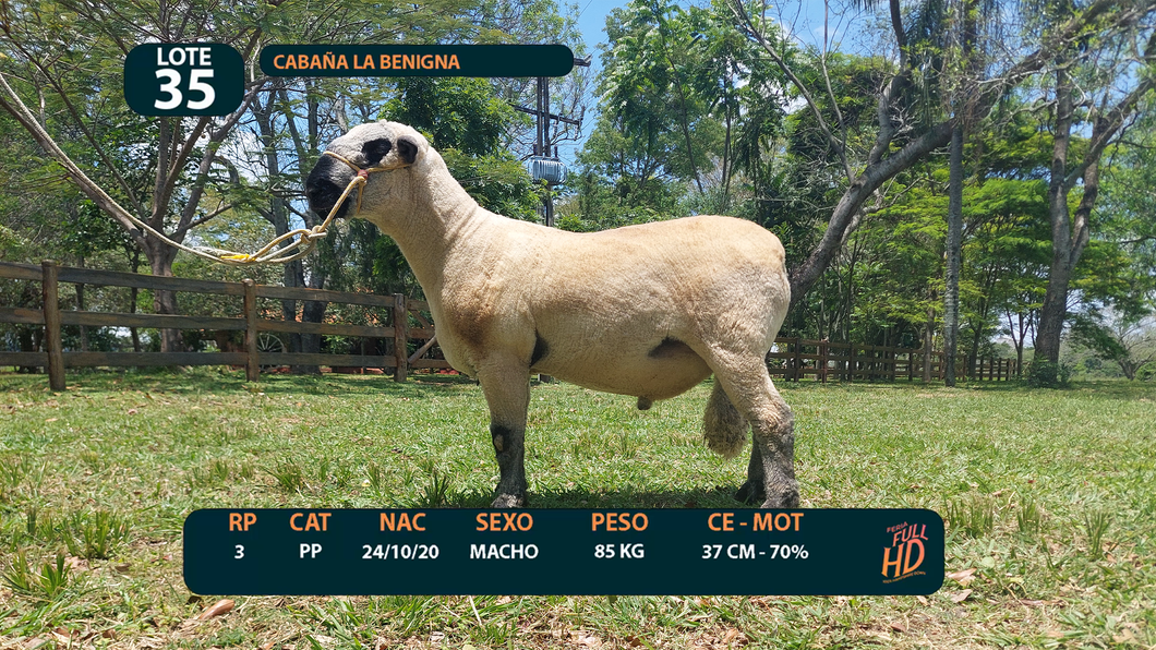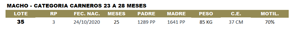 Carnero PP, nacido el 24/10/20, peso 85 Kg, hijo de hembra importada de