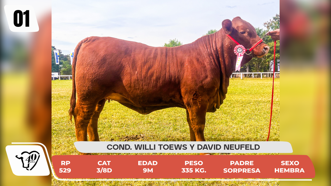 Obs: Ternera muy larga, femenina y de buena estructura, de mucha consistencia por su número de generaciones, hija de la 1793, Donante importada de Quilpo Norte, de 5ta Generacion, de Linea Acorazado. Y por linea Paterna tiene a Sorpresa, padre de multiples Campeones del Ultimo Mundial Brangus de la Argentina. que conjuga a Marathon y Cassius Clay, dos Padre de la Raza, lideres en Deps, para facilidad de parto y crecimiento. Sin dudas una futura Donante. Recibió mención en su categoria donde participaron 22 Terneras.
