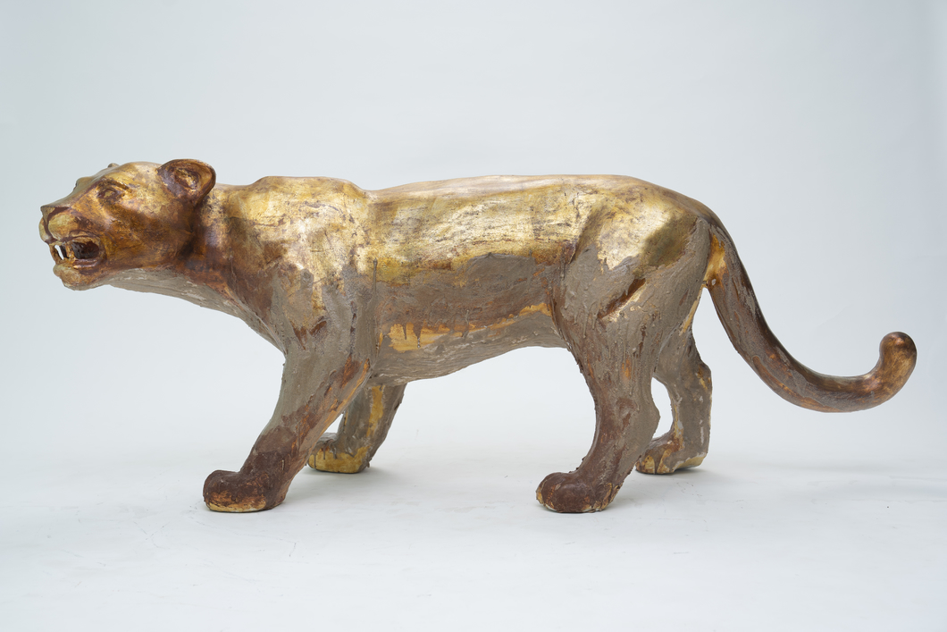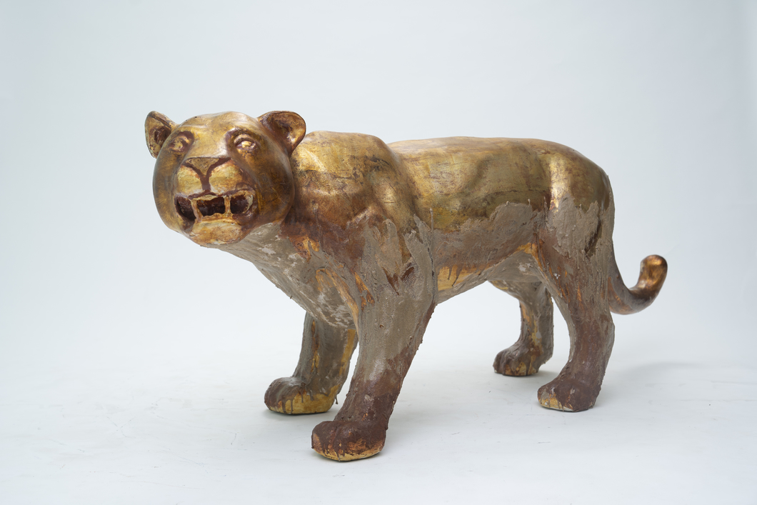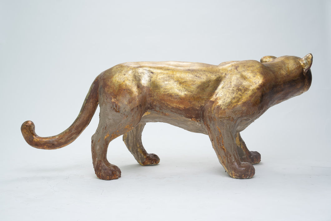 TÉCNICA: BARNIZ Y FOIL DORADO Y BRONCE, BARRO Y TIERRA. INTERVENCIÓN SOBRE LA OBRA DE ESCULTURA DE YAGUARETÉ.