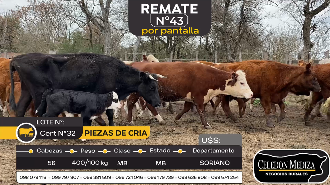 Buen lote de piezas de cria, destacado por volumen y calidad. Vacas con buena caja que después de cria sus terneros serán una buena invernada. Ganado rústico que de pasar a buenas comidas responderan muy bien. Destacada oferta que sale a la venta en la boca de la primavera.