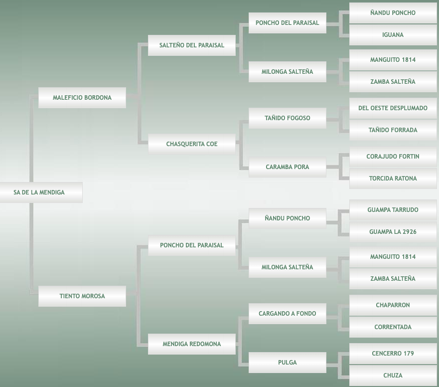Por parte de padre Malefico Bordona, padrillo y yegua ganadores de marcha, entre ellos Chasquerita Coe ganadora de varios chasques y poncho del paraisal finalista de marcha internacional.