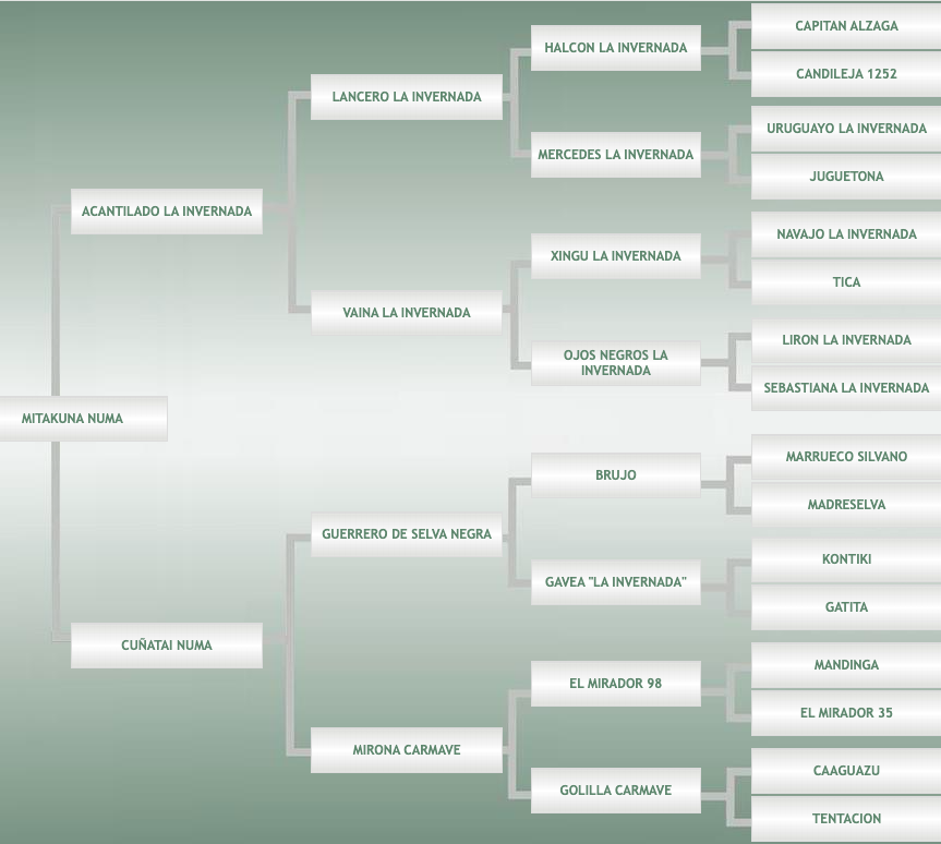 Su madre, Cuñatai Numa, por Guerrero de Selva Negra, padrillo moro origen Selva Negra y Mirona Carmave, muy buen pingo, origen de Carlos María Verdier Cenóz.