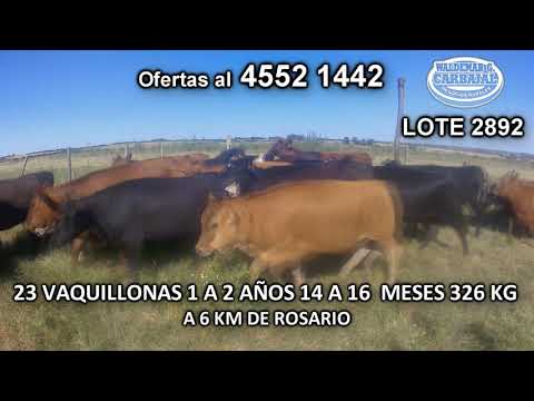 LOTE 26, 23 Vaquillonas 1 a 2 años 6 RA- 6 AA c/ HE- 6 AA- 2 LI- 1 CH- 1 RA c/ AA- 1 HE c/ RA a remate en Pantalla #80 326 Kgkg - en Costa de Navarro- A 6 km de Rosario