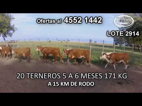 Lote 50 % pesado Max 235 Kg- Min 142 Kg. Excelente lote de terneros Polled Hereford marca líquida de estancia. Bien desarrollados, sanos, parejos en tamaño, estado y calidad. Están al pie de sus madres y se destetan a la entrega. Son 17 castrados y 3 esnteros. Un ganadaso. Certificados el 26/01/2019. LOTE RECOMENDADO.