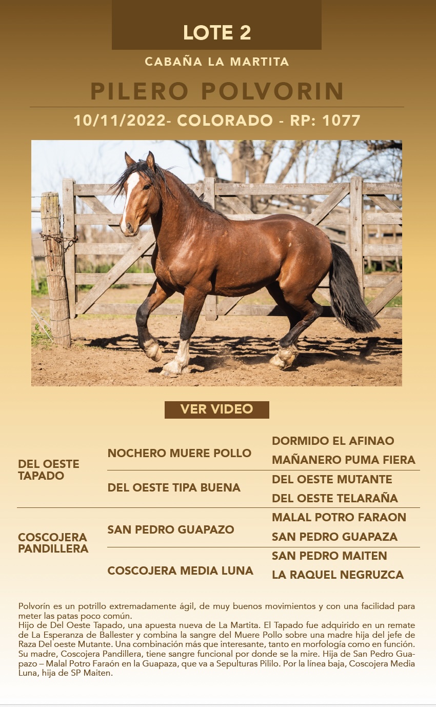 LOTE 2, PILERO POLVORIN 🔥 🔥 🔥 Lote Anterior Volver al remate Lote Siguiente Ficha Contacto Ofertar Buenos Aires - Ficha del Lote Identificador: #338790 Categoría: Macho Pedigree Buenos Aires - Ofertar Fecha de cierre: 22 de Septiembre a las 14:00hs. Aún no tiene ofertas Plazo: Contado 30 días 45 días 60 días 90 días 120 días 180 días Contado, 30 y 60 dias Su Oferta en $: − + Step: -10.000,00 / +10.000,00 Programar puja hasta: Programar puja hasta Aumentar puja programada 240000 420000 **Oferta al bulto Iniciar sesión para ofertar Ofertar Compra por $ 99.000.000,00 Ofertas Recibidas $ Fecha/Hora Estado Este lote aún no tiene preofertas. ¿Estás seguro de comprar el LOTE PILERO POLVORIN por $ 99000000 ? 288 Visualizaciones ClicData Contacto Empresa: El Rincón Criollos Nombre*: Teléfono* : E-mail* : Mensaje Enviar