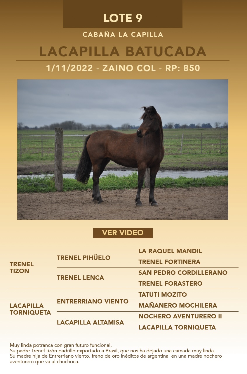 LOTE 9, LACAPILLA BATUCADA 🔥 🔥 🔥 Lote Anterior Volver al remate Lote Siguiente Ficha Contacto Ofertar Buenos Aires - Ficha del Lote Identificador: #338797 Categoría: Potrancas Pedigree Buenos Aires - Ofertar Fecha de cierre: 22 de Septiembre a las 14:00hs. Aún no tiene ofertas Plazo: Contado 30 días 45 días 60 días 90 días 120 días 180 días Contado, 30 y 60 dias Su Oferta en $: − + Step: -10.000,00 / +10.000,00 Programar puja hasta: Programar puja hasta Aumentar puja programada 270000 450000 **Oferta al bulto Iniciar sesión para ofertar Ofertar Compra por $ 99.000.000,00 Ofertas Recibidas $ Fecha/Hora Estado Este lote aún no tiene preofertas. ¿Estás seguro de comprar el LOTE LACAPILLA BATUCADA por $ 99000000 ? 241 Visualizaciones ClicData Contacto Empresa: El Rincón Criollos Nombre*: Teléfono* : E-mail* : Mensaje Enviar