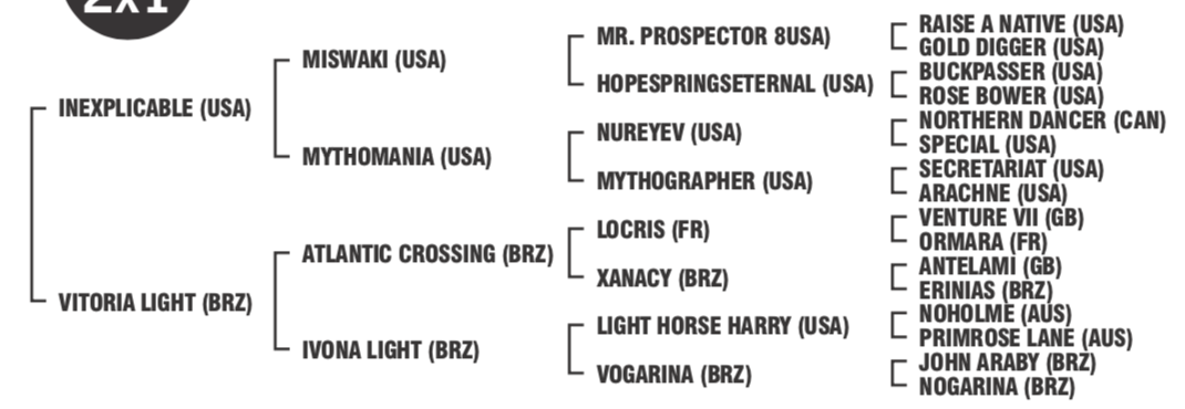 Por INEXPLICABLE, USA, 1995 - Ganador de 6 carreras en Canadá y Estados Unidos, US$ 378,315, incl. Canadian Turf H.[Gr3] y New Hampshire Sweepstakes H.[G3] (ntr); 2° Bernard Baruch H.[Gr2]. Es hijo del extraordinario MISWAKI, padre de ganadores de mas de 2000 carreras, 95 ganadores clasicos, entre el los “campeones” URBAN SEA (Prix de l'Arc de Triomphe [Gr1]), MISWAKI TERN (Pr. Ribot [Gr1]), MISIL (Pr. Roma [Gr1]) e KISTENA (Prix de l'Abbaye de Longchamp [Gr1]). Sus hijos BLACK TIE AFFAIR y MIDYAN, padrillos. Es padre dos ganadores clássicos FAST LOOK (GP ABCPCC [Gr1] y ganadora de Copa ACPCCP - Turfe Paranaense, con record en 38”:8/10), JABURU VIP (GP Paraná [Gr1]), INCHATILLON (“Troféu Mossoró Yegua de 4 y mais años” - GP Diana [Gr1], GP Roberto e N. G. Seabra [G1]), JÉCA (GP Paraná [Gr1], GP Natal [Gr3]), AMA-TIRI [GP Antonio Correa Barbosa [Gr2], HERICOAQUARA [GP José C. Asumpção [Gr2]), FIORENTINO [Clás. Outono [L], ALEGORIA (GP Diana [L]), NEIGHBORHOODS (Clás. Luiz Rigoni [L]), MARCIAL (PE Gustavo Philadelpho Azevedo); ORIENT INEXPLICABLE (Clás. Jockey Club do RGS - Criterium), ABMAEL (PE Alino F. de Castro), HURRY YOU, ABMAEL, ALFORRIADO, BLESSED OF GOD, BOM VIVI, CAFEIGUE, DEVIL'S BULLET, FEATURE, GANACHE, GOLDELETRA, HOMBRE REI, HURRY YOU, ICONE SIX, KAHUNA, MARCIAL, MISTAKEN ID, NEW FOREST, ORIENT INEXPLICABLE, ULTRA CORUNILHA, VOYAGEUR DE PARIS, etc..