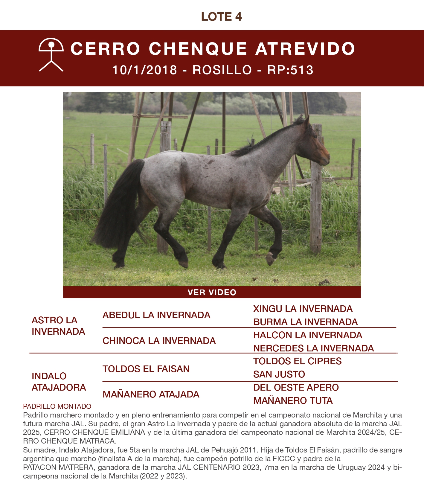 LOTE 4, CERRO CHENQUE ATREVIDO 🔥 🔥 🔥 Lote Anterior Volver al remate Lote Siguiente Ficha Contacto Ofertar Buenos Aires - Ficha del Lote Identificador: #343912 Categoría: Padrillos RP: 513 Pedigree Buenos Aires - Ofertar Fecha de cierre: 14 de Octubre a las 13:30hs. Aún no tiene ofertas Plazo: Contado 30 días 45 días 60 días 90 días 120 días 180 días Contado, 30 y 60 dias Su Oferta en $: − + Step: -20.000,00 / +20.000,00 Programar puja hasta: Programar puja hasta Aumentar puja programada 440000 800000 **Oferta al bulto Iniciar sesión para ofertar Ofertar Compra por $ 99.000.000,00 Ofertas Recibidas $ Fecha/Hora Estado Este lote aún no tiene preofertas. ¿Estás seguro de comprar el LOTE CERRO CHENQUE ATREVIDO por $ 99000000 ? 177 Visualizaciones ClicData Contacto Empresa: El Rincón Criollos Nombre*: Teléfono* : E-mail* : Mensaje Enviar Registrese gratis Este contenido Exclusivo está disponible sólo para usuarios registrados Ingresar