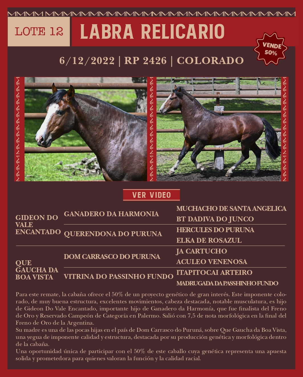 LOTE 12, LABRA RELICARIO 🔥 🔥 🔥 Lote Anterior Volver al remate Lote Siguiente Ficha Contacto Ofertar Buenos Aires - Ficha del Lote Identificador: #344817 Categoría: Macho RP: 2426 Pedigree Buenos Aires - Ofertar Se vende 50% Fecha de cierre: 20 de Octubre a las 14:00hs. Aún no tiene ofertas Plazo: Contado 30 días 45 días 60 días 90 días 120 días 180 días Contado, 30 y 60 dias Su Oferta en $: − + Step: -20.000,00 / +20.000,00 Programar puja hasta: Programar puja hasta Aumentar puja programada 540000 900000 **Oferta al bulto Iniciar sesión para ofertar Ofertar Compra por $ 99.000.000,00 Ofertas Recibidas $ Fecha/Hora Estado Este lote aún no tiene preofertas. ¿Estás seguro de comprar el LOTE LABRA RELICARIO por $ 99000000 ? 294 Visualizaciones ClicData Contacto Empresa: El Rincón Criollos Nombre*: Teléfono* : E-mail* : Mensaje Enviar Registrese gratis Este contenido Exclusivo está disponible sólo para usuarios registrados Ingresar
