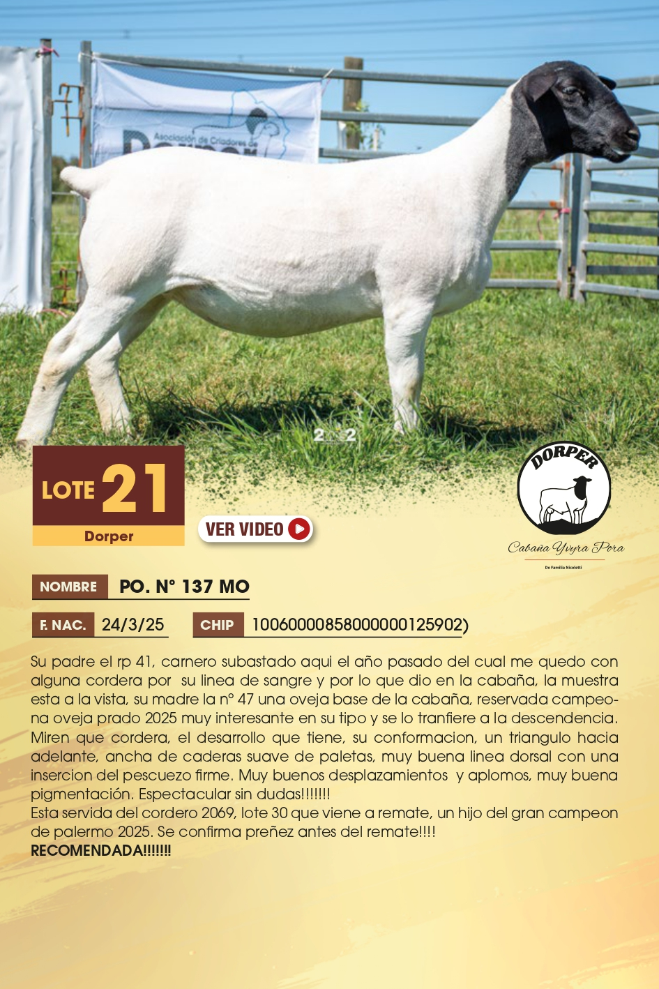 LOTE 21 - Dorper, 21 - Dorper 🔥 🔥 🔥 Lote Anterior Volver al remate Lote Siguiente Ficha Contacto Ofertar Canelones - Ficha del Lote Identificador: #347392 Categoría: Carneros Pedigree Plazo 12 cuotas Información Genética RP 137 RP 137 PRECIO BASE 0.00 NOMBRE PO. Nº 137 MO Canelones - Ofertar Fecha de cierre: 08 de Noviembre a las 12:00hs. Aún no tiene ofertas Animales: 137 Plazo: Contado 30 días 45 días 60 días 90 días 120 días 180 días Contado, 30 y 60 dias 12 CUOTAS Su Oferta en $: (por 12 cuotas) − + Step: -10,00 / +10,00 Programar puja hasta: Programar puja hasta Aumentar puja programada 60 240 Iniciar sesión para ofertar Ofertar Compra por $ 99.000.000,00 Ofertas Recibidas $ Fecha/Hora Estado Este lote aún no tiene preofertas. ¿Estás seguro de comprar el LOTE 21 - Dorper por 12 cuotas de $ 99000000 ? 56 Visualizaciones ClicData Contacto Empresa: JUAN FRANCISCO CHIRUCHI Nombre*: Teléfono* : E-mail* : Mensaje Por informes y consultas 099977007 Enviar Registrese gratis Este contenido Exclusivo está disponible sólo para usuarios registrados Ingresar