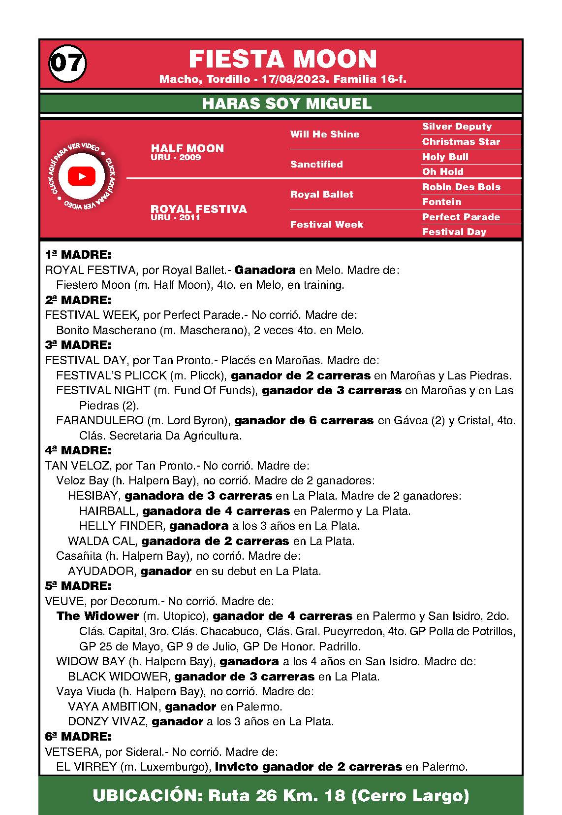 LOTE 7, FIESTA MOON 🔥 🔥 🔥 Lote Anterior Volver al remate Lote Siguiente Ficha Contacto Ofertar Cerro Largo - Melo Ficha del Lote Identificador: #348862 Categoría: Potrillo Pedigree Cerro Largo - Melo Ofertar Fecha de cierre: 18 de Noviembre a las 17:00hs. Aún no tiene ofertas Plazo: Contado 30 días 45 días 60 días 90 días 120 días 180 días Contado, 30 y 60 dias Su Oferta en U$S: − + Step: -10,00 / +10,00 Programar puja hasta: Programar puja hasta Aumentar puja programada 370 550 **Oferta al bulto Iniciar sesión para ofertar Ofertar Compra por U$S 99.000.000,00 Ofertas Recibidas U$S Fecha/Hora Estado Este lote aún no tiene preofertas. ¿Estás seguro de comprar el LOTE FIESTA MOON por U$S 99000000 ? 27 Visualizaciones ClicData Contacto Empresa: JUAN FRANCISCO CHIRUCHI Nombre*: Teléfono* : E-mail* : Mensaje Por informes y consultas 099977007 Enviar Registrese gratis Este contenido Exclusivo está disponible sólo para usuarios registrados Ingresar