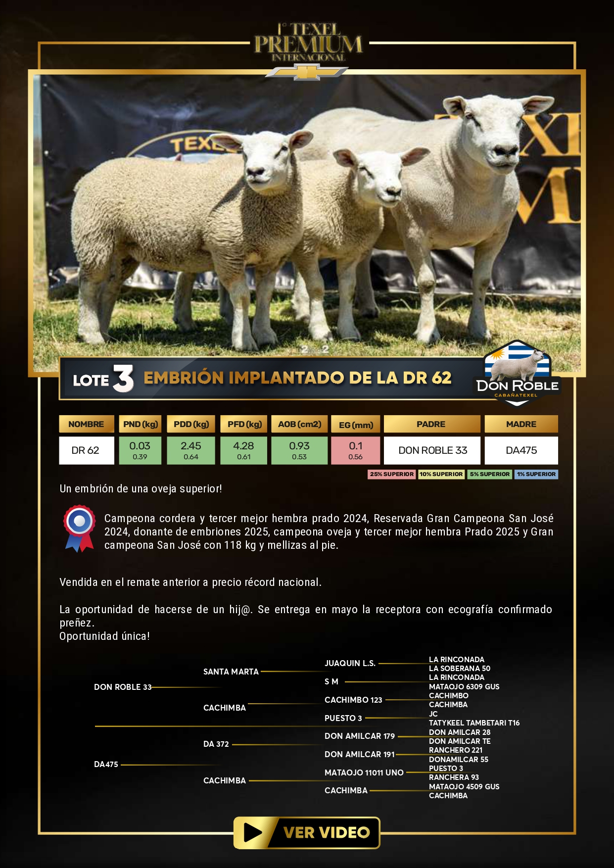 LOTE 3 - Don Roble Cabaña Texel, EMBRION IMPLANTADO DE LA DR 62